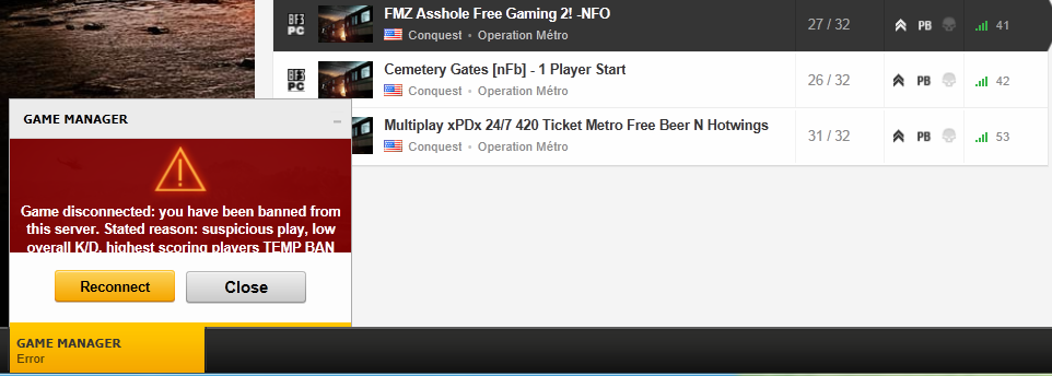 Aparently Posi, Agent, a random, and myself pulling Ace Squad and having positive K:D ratios amounted to "a suspiciously high K:D" and we all needed to be banned for it. Love shitty servers (it was the one highlighted).