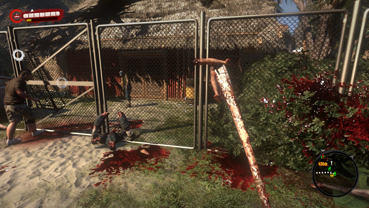 You're not the only one who has to worry about stamina; Zombies have it as well, displayed as clearly as their health. This means you can knock them about to keep them from attacking back, and it also gives the weapons truly unique roles. A hammer will stun a zombie, while a machete will really hurt him. The hammer manages the crowd, the machete seals the deal. The result is a fantastic melee combat system about exhaustion, severed limbs, knockback, broken knives, hacking the unholy heck out of this damned zombie, and buckets and buckets of blood. So much blood. Lots of blood. Who would have thought these things could have so much blood in them?